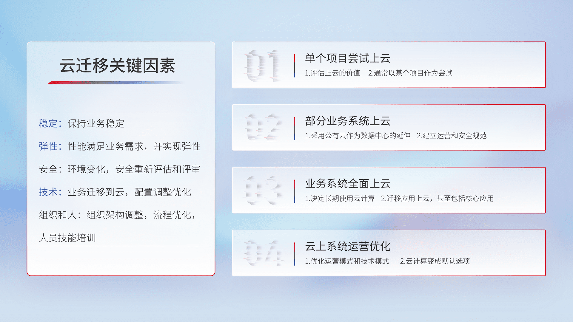 结合实际业务,,,从规划设计、、云平台选型、、、云原生改造、、、数据迁移、、集成交付,,,,迁移全过程为客户识别最佳上云路径,,做好风险识别管理,,设计网络架构、、、、身份权限、、、、安全审计合规、、操作审计、、、、日志审计、、监控告警策略、、、、多站点容灾设计等,,,,对云上基础设施进行整体规划,,提升IT治理水平,,,以满足弹性、、高可用、、、、高性能的需求。。。
