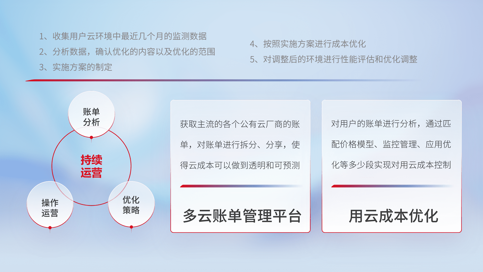 通过多云纳管,,以统一的资源数据模型把客户的云资源进行抽象和封装,,,进而实现对多云资源的统一操作,,,保障云资源管理的可靠性、、、稳定性与可用性。。。。量身定制化运维内容,,配置、、、、开发运维、、、补丁管理、、、、备份、、、监控、、、、认证和访问管理、、、审计和日常巡检等,,,保障在用云过程中的可靠度,,,,稳定度以及高可用率。。。。
